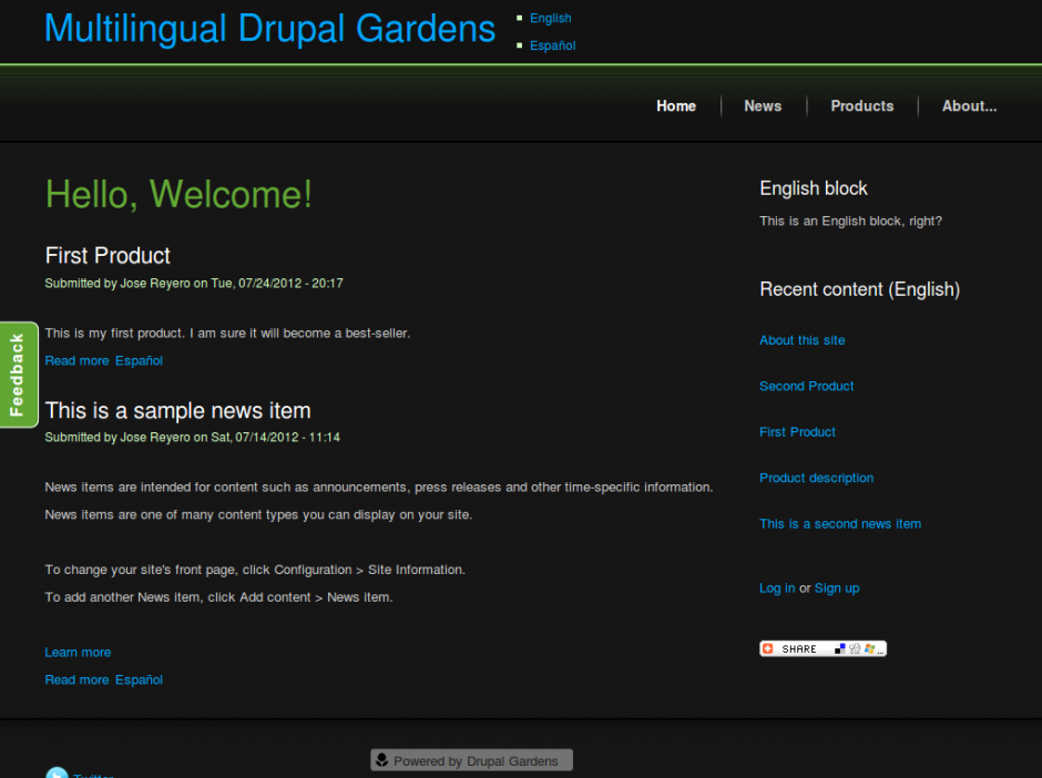 So, since Drupal is so powerful and flexible, that they say ;-), I was wondering how hard it could be to build some basic multilingual web site only with the modules and features they provide with Drupal Gardens. Let's see... you have all Drupal core -which includes Locale and Content translation-, you have Views, you have Pathauto, then you have Block visibility options which are more flexible than some people imagine... It seems there are some features missing but we'll try to substitute that with some.. imagination.. (that you may call ugly workarounds too).