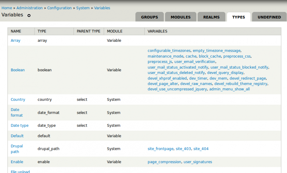 These are a few add-ons for Drupal 7 Variable module that just got out of my sandbox. A module to provide a 'File' variable type and a module to help developers keep track of variables and variable types. They are contained in the Variable Extra package, see links at the bottom.